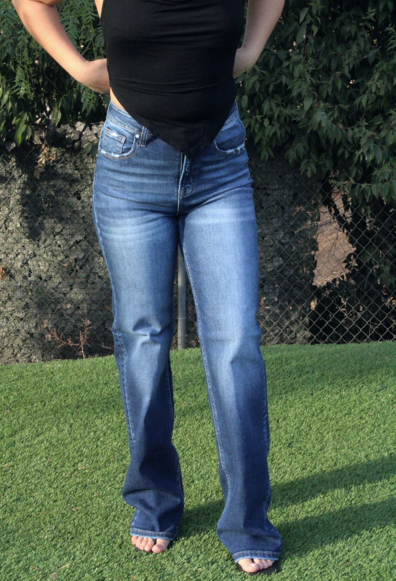 Style our Mia Dark Wash Jeans. These form-fitting boot cut jeans feature a sleek dark wash that flatters every figure. Perfect for dressing up or down, these jeans will be your new go-to for any occasion.